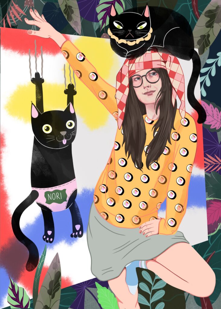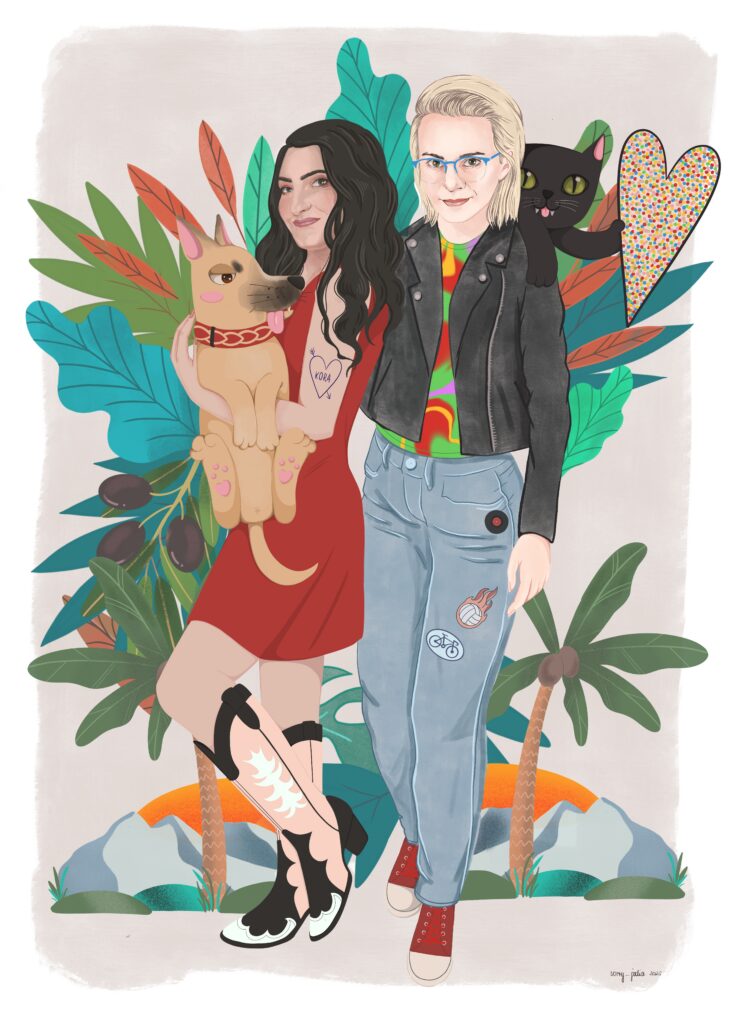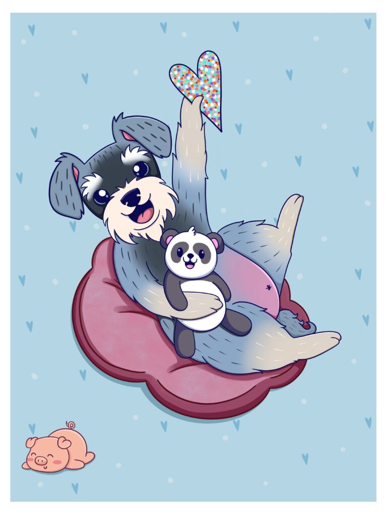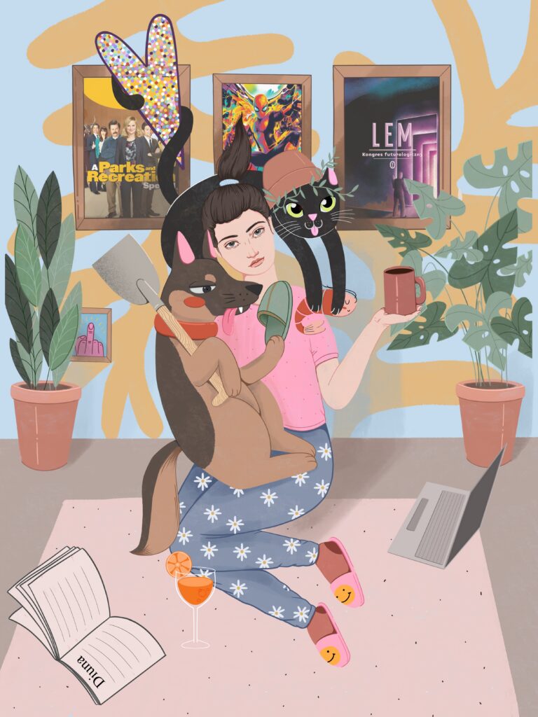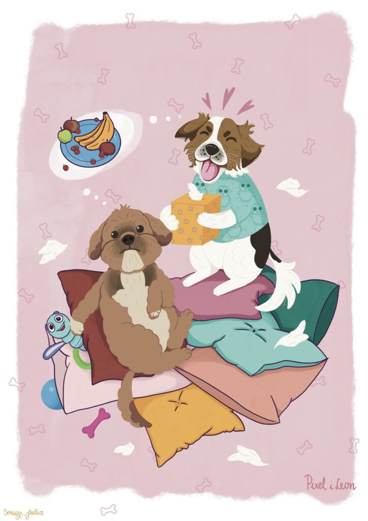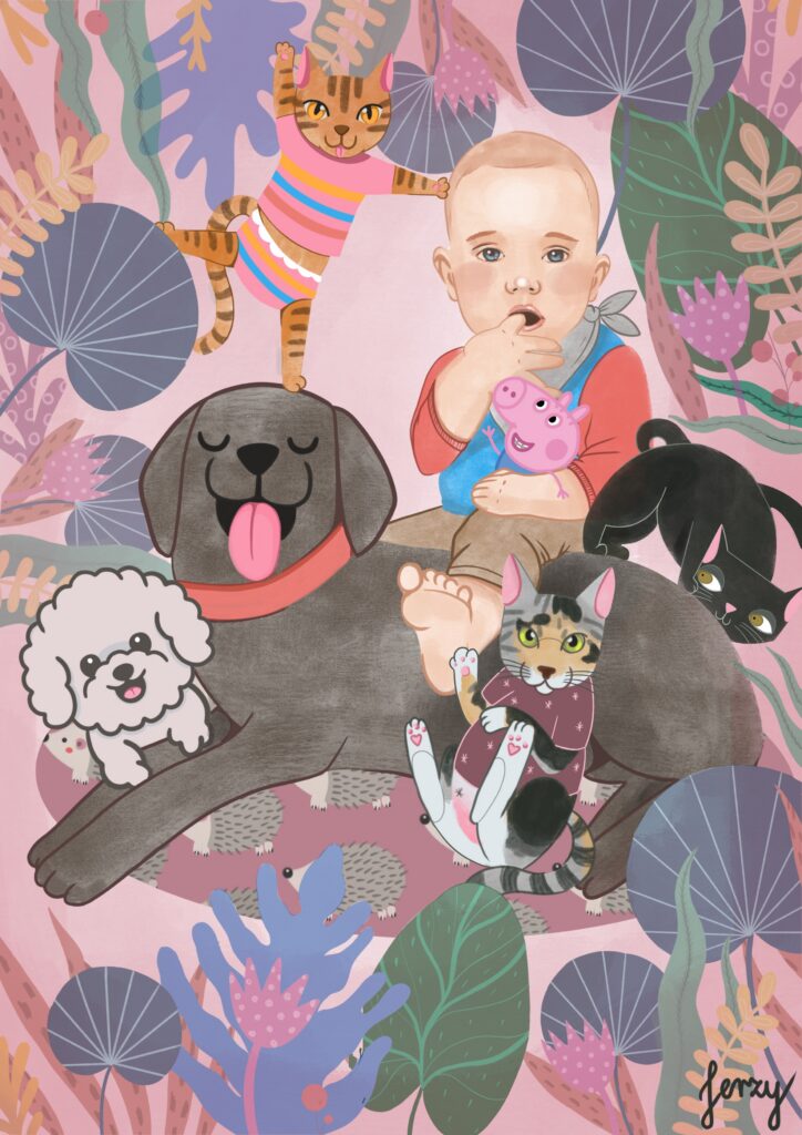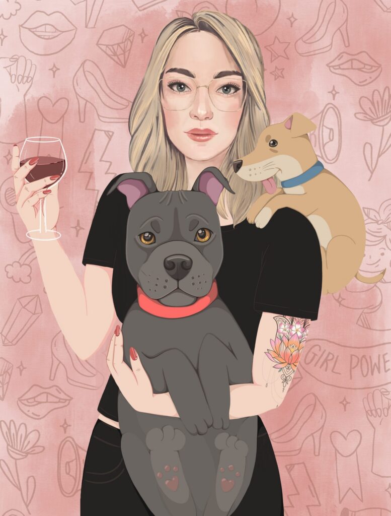 Najczęściej tworzę spersonalizowane ilustracje Waszych pupili – to właśnie od moich dwóch psów zaczęła się moja przygoda z tą formą sztuki. Z czasem zaczęłam realizować również zamówienia na portrety par czy rodzin, które stanowią oryginalną i wyjątkową pamiątkę. Moje ilustracje nie są zwykłymi portretami – zawsze zawierają dawkę humoru i pozytywnej energii. Choć nie są realistyczne, potrafią uchwycić charakter zwierzaka czy osoby, a dzięki ogromnej dbałości o detale stają się niepowtarzalne. Nie ważne czy chcesz żebym stworzyła dla Ciebie psa z serem żółtym na głowie czy złodziejaszka, który kradnie skarpetki. Obiecuję, że twoja ilustracja będzie jedyna w swoim rodzaju. Zależy mi na tym, aby każda praca wywoływała uśmiech i przypominała, jak ważne są dla nas bliskie osoby i nasze zwierzaki.