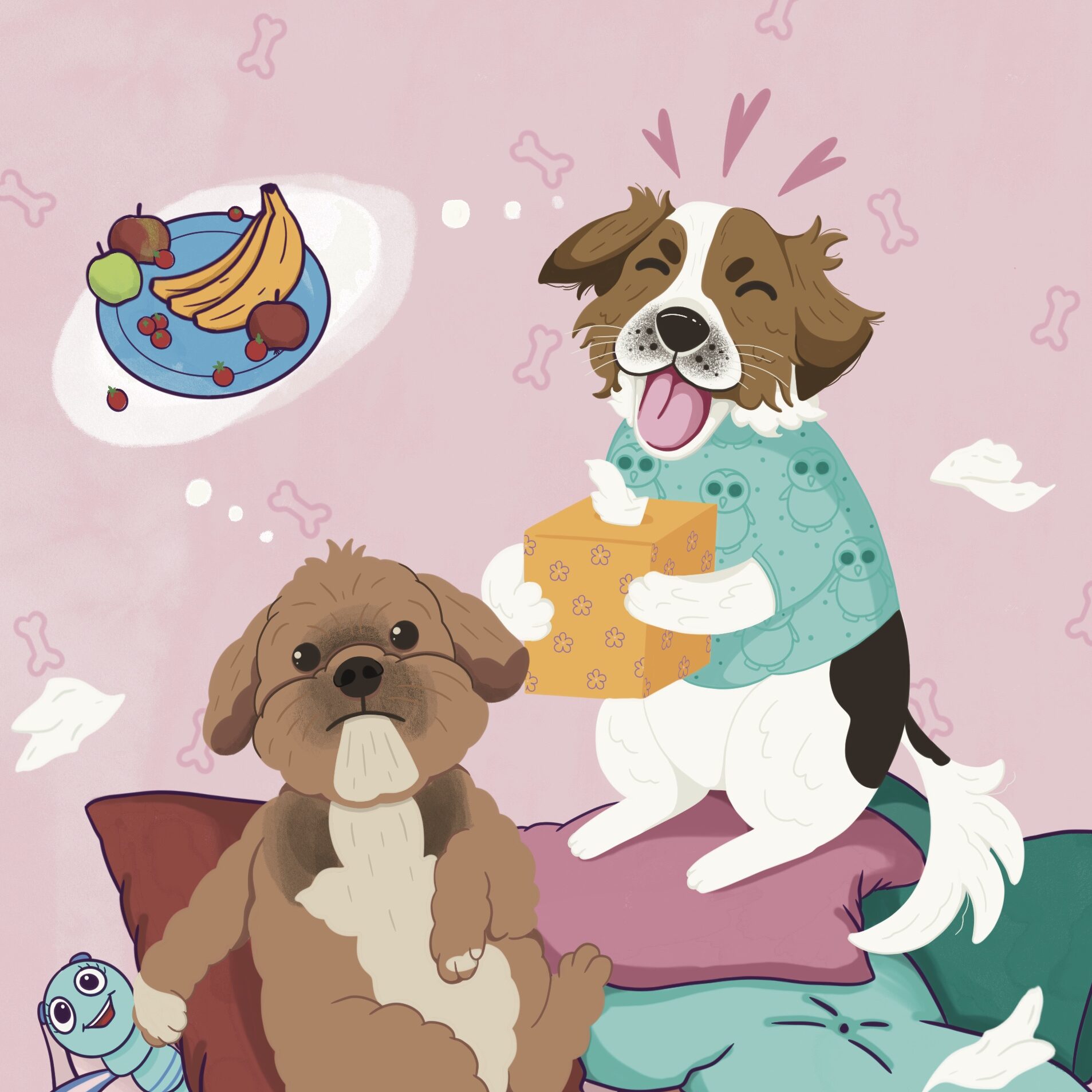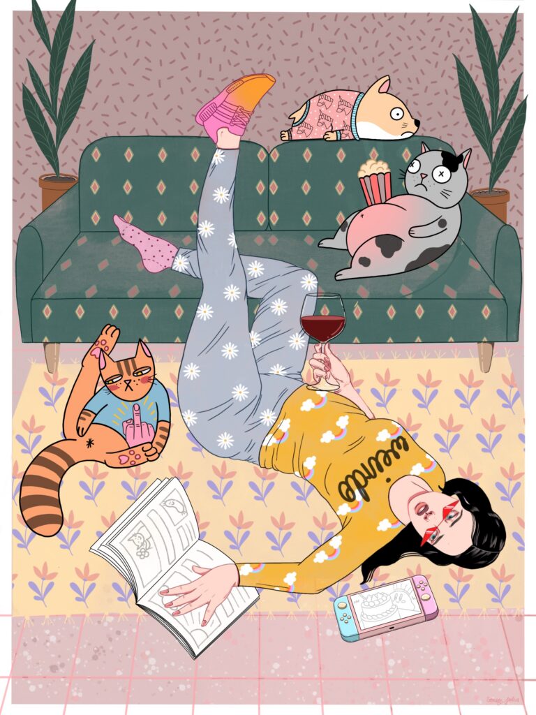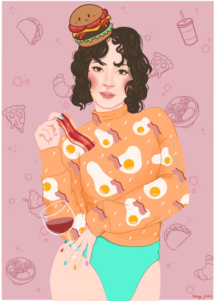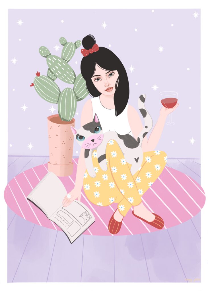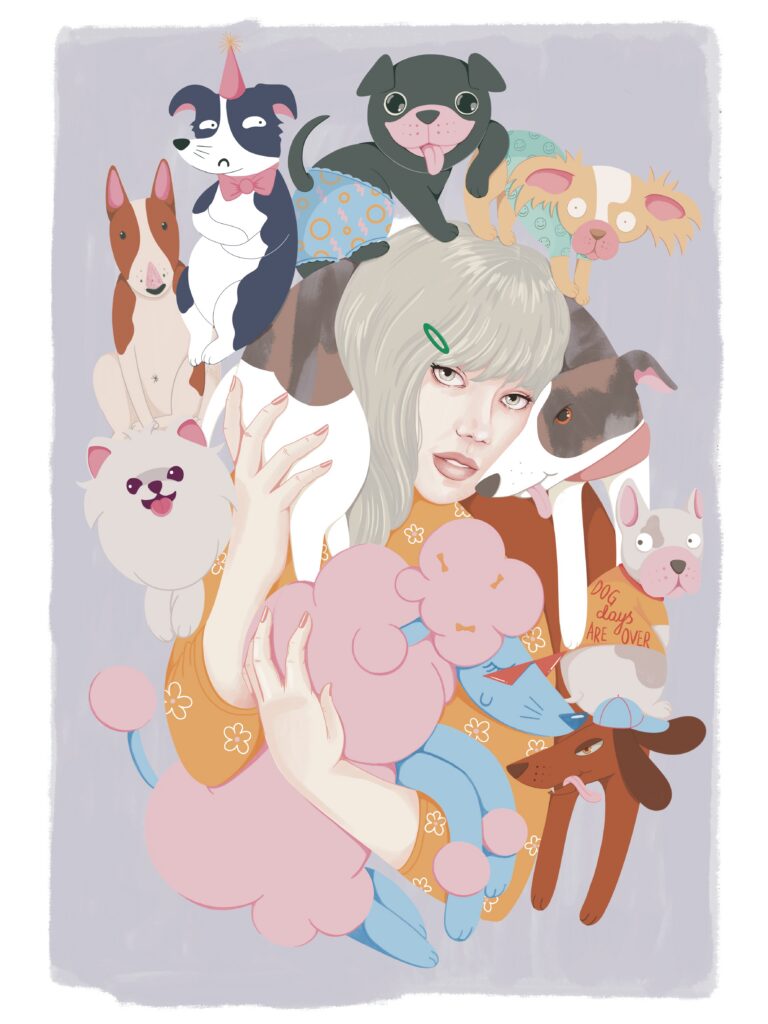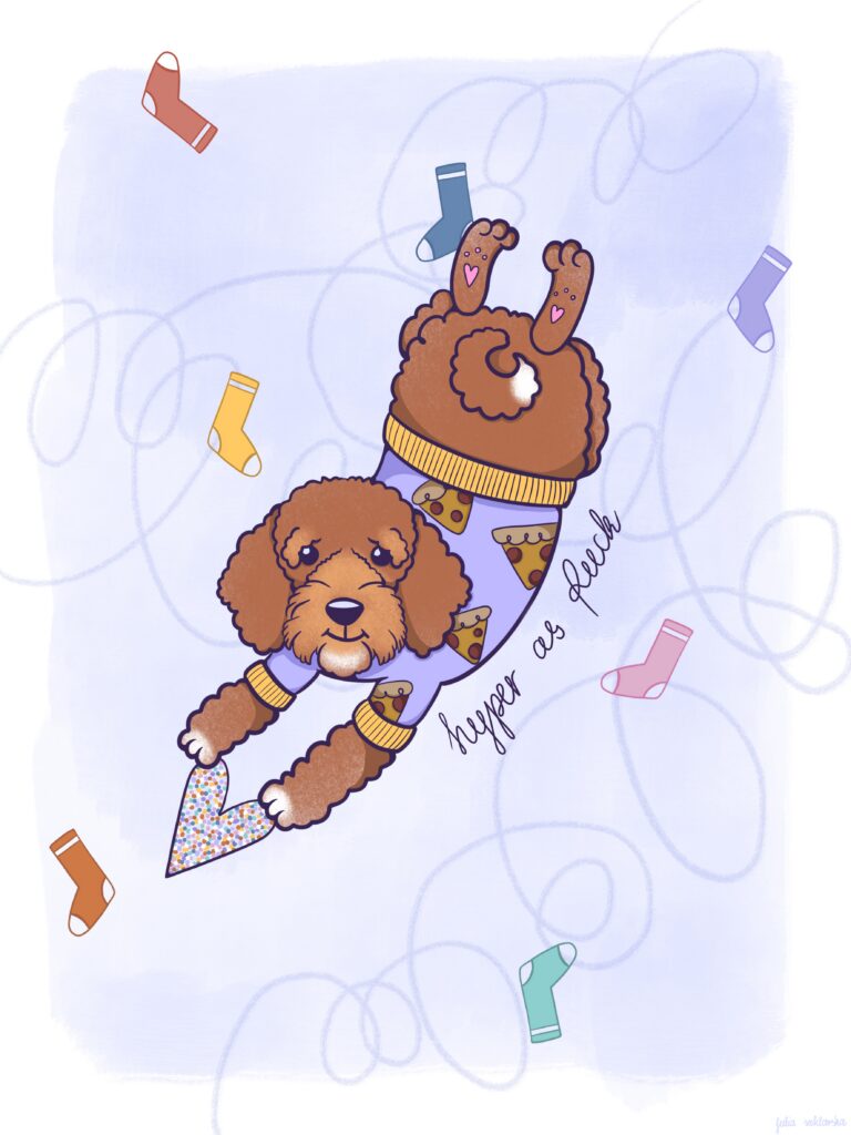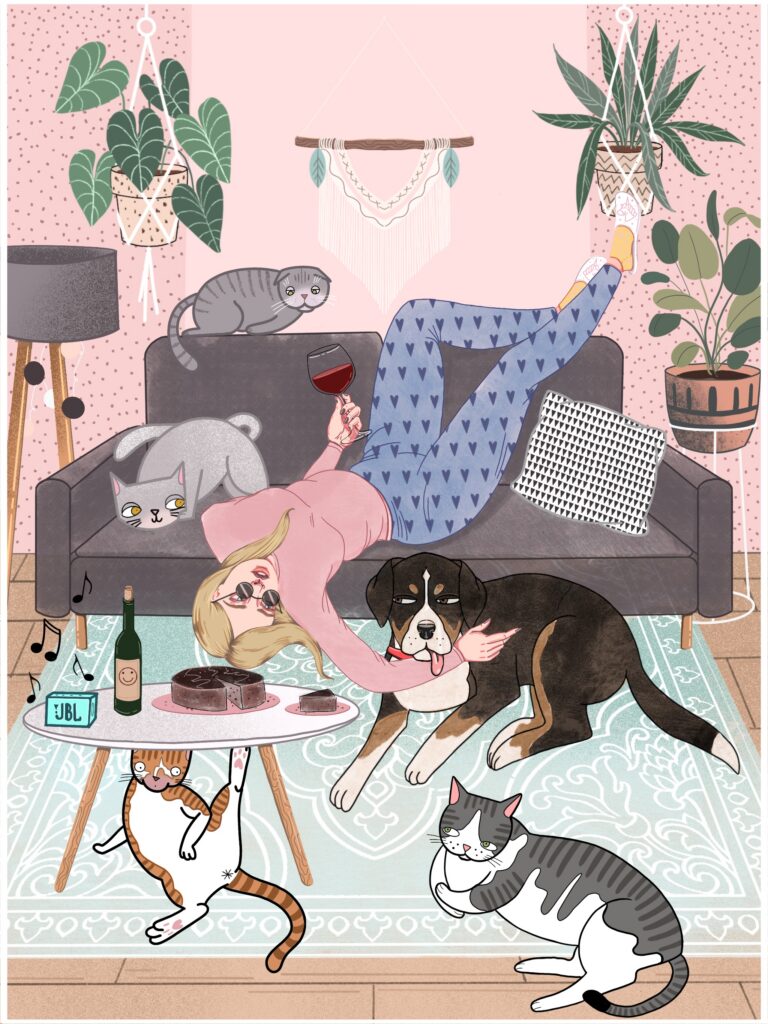 Najczęściej tworzę spersonalizowane ilustracje Waszych pupili – to właśnie od moich dwóch psów zaczęła się moja przygoda z tą formą sztuki. Z czasem zaczęłam realizować również zamówienia na portrety par czy rodzin, które stanowią oryginalną i wyjątkową pamiątkę. Moje ilustracje nie są zwykłymi portretami – zawsze zawierają dawkę humoru i pozytywnej energii. Choć nie są realistyczne, potrafią uchwycić charakter zwierzaka czy osoby, a dzięki ogromnej dbałości o detale stają się niepowtarzalne. Nie ważne czy chcesz żebym stworzyła dla Ciebie psa z serem żółtym na głowie czy złodziejaszka, który kradnie skarpetki. Obiecuję, że twoja ilustracja będzie jedyna w swoim rodzaju. Zależy mi na tym, aby każda praca wywoływała uśmiech i przypominała, jak ważne są dla nas bliskie osoby i nasze zwierzaki.