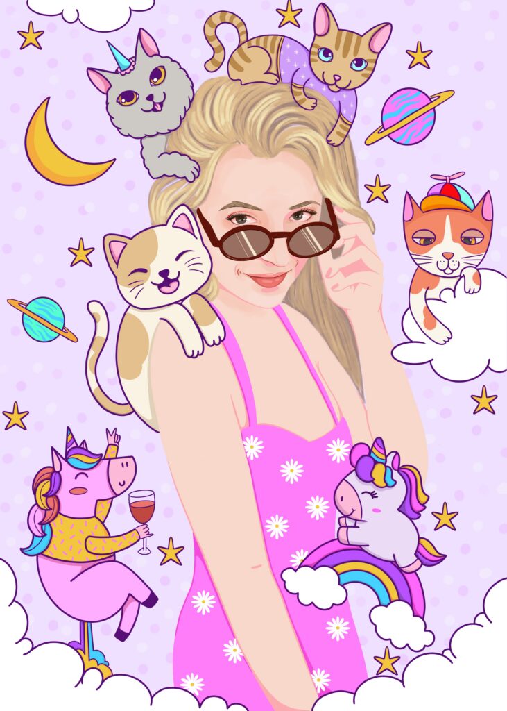 dziewczyna z kotami i jednorożcami – prezent dla przyjaciółki